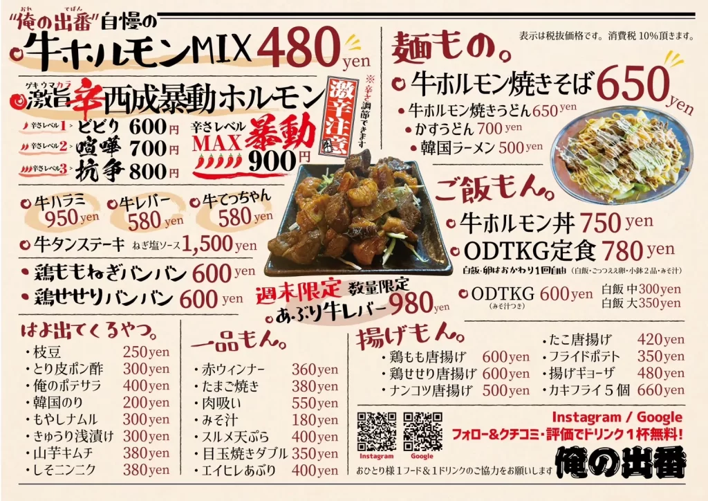 ※推しポイント:名物牛ホルモンMIX(西成エリアでは豚ホルモン主流の中で“牛”が強み)屋台×大衆価格、ユニークな「おもしろメニュー(例:ちくちゅー/びーちく/永谷園)」